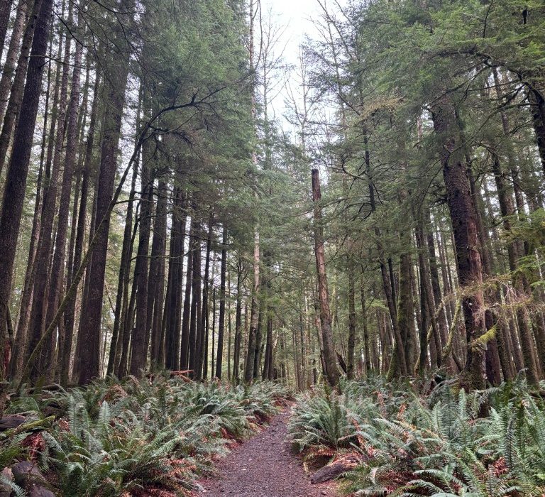 This 2-4 foot wide well-maintained trail meanders beside a babbling brook and eventually crosses it. The almost 4 mile trail includes mild inclines and declines, well-spaced out with roots to tackle from the giant pine trees, in this old-growth rainforest. So much fun! The latter portion of the out and back trail leads to expansive views of the crashing waves of the Pacific from well above it. On the way back follow the “day use picnicking area” sign to take the short jaunt out onto the beautiful rocky (“Short Sand”) beach in the cove.